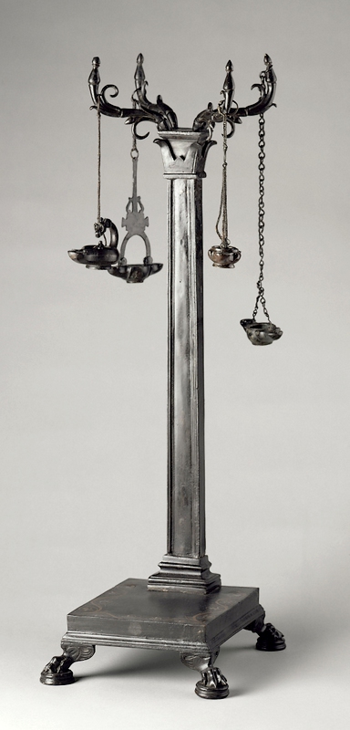 Candélabre porte-lampes, Rome antique : incrustations de cuivre et d'argent sur la base décorée de rinceaux et de palmettes. Les 4 branches issues du fût quadrangulaire servaient à suspendre par des chaînes les 4 lampes dont la présence est attestée par une gravure de 1862 1er siècle ap J.C (avant 79) Collection Durand puis Pourtalès, 1865. Musée du Louvre